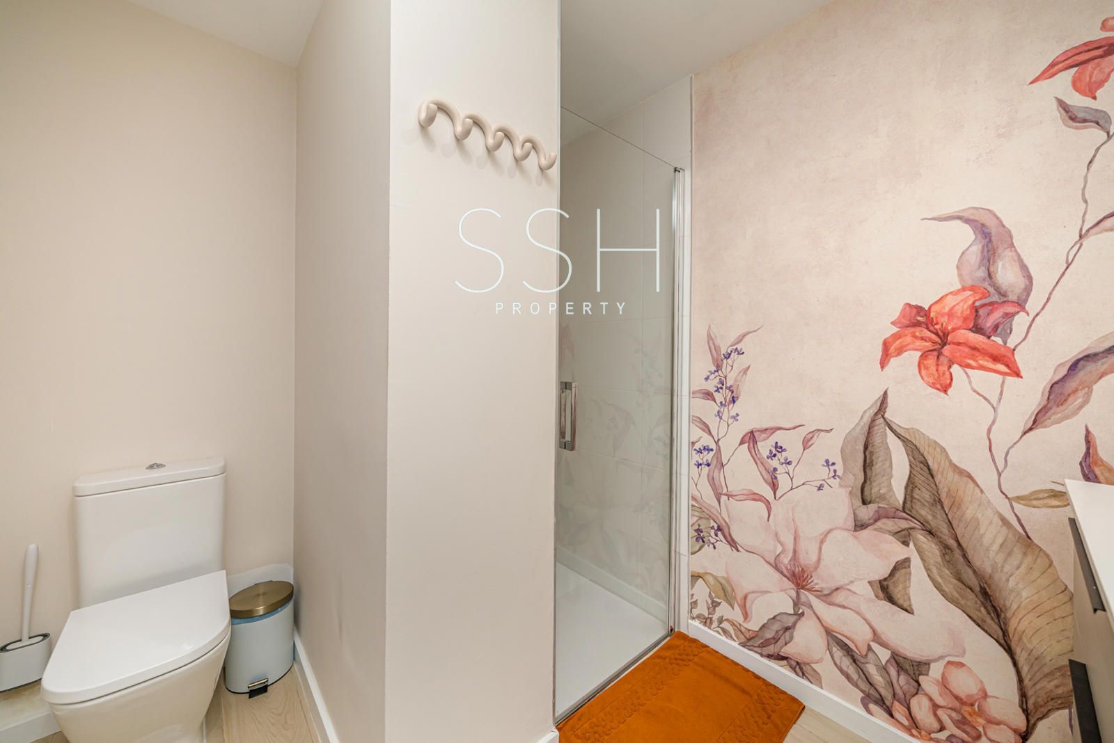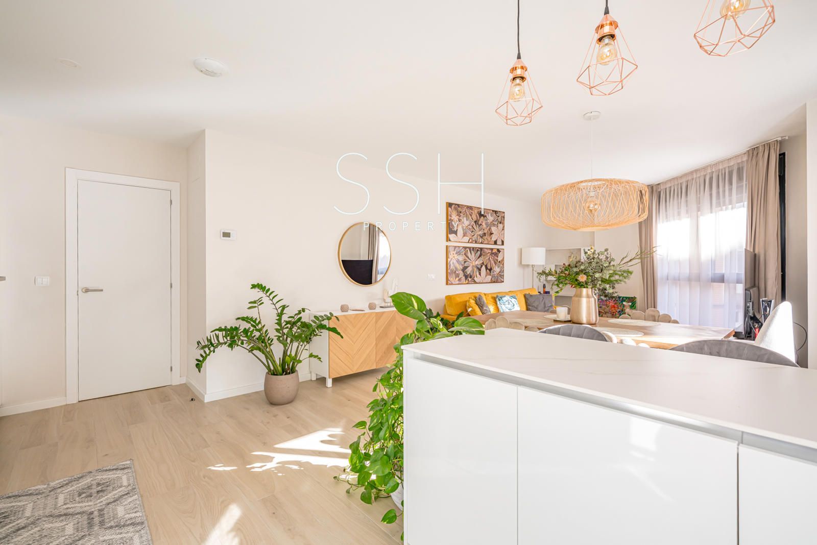 Al acceder a la vivienda, un elegante hall de entrada con armario da la bienvenida y aporta una práctica zona de almacenaje. A continuación, se abre un amplio y muy luminoso espacio diáfano que integra salón, comedor y cocina tipo americana, decorado en suaves tonos pastel que aportan sensación de amplitud, calma y modernidad.